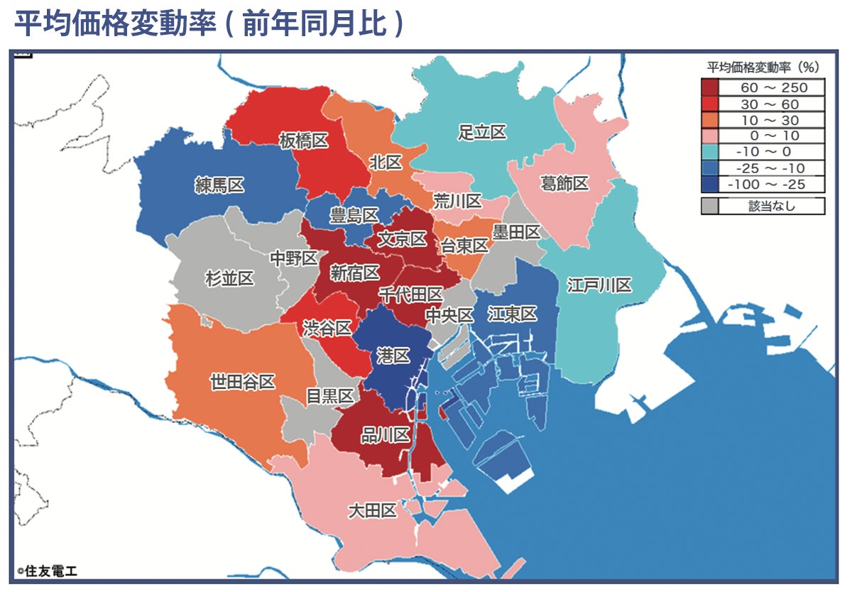 東京23区を各行政区毎に供給戸数、平均価格、平均面積、平均坪単価を前年同月も併せて算出。また前年対比での価格変動率を変動幅毎に区分けしポリゴン表示しました。