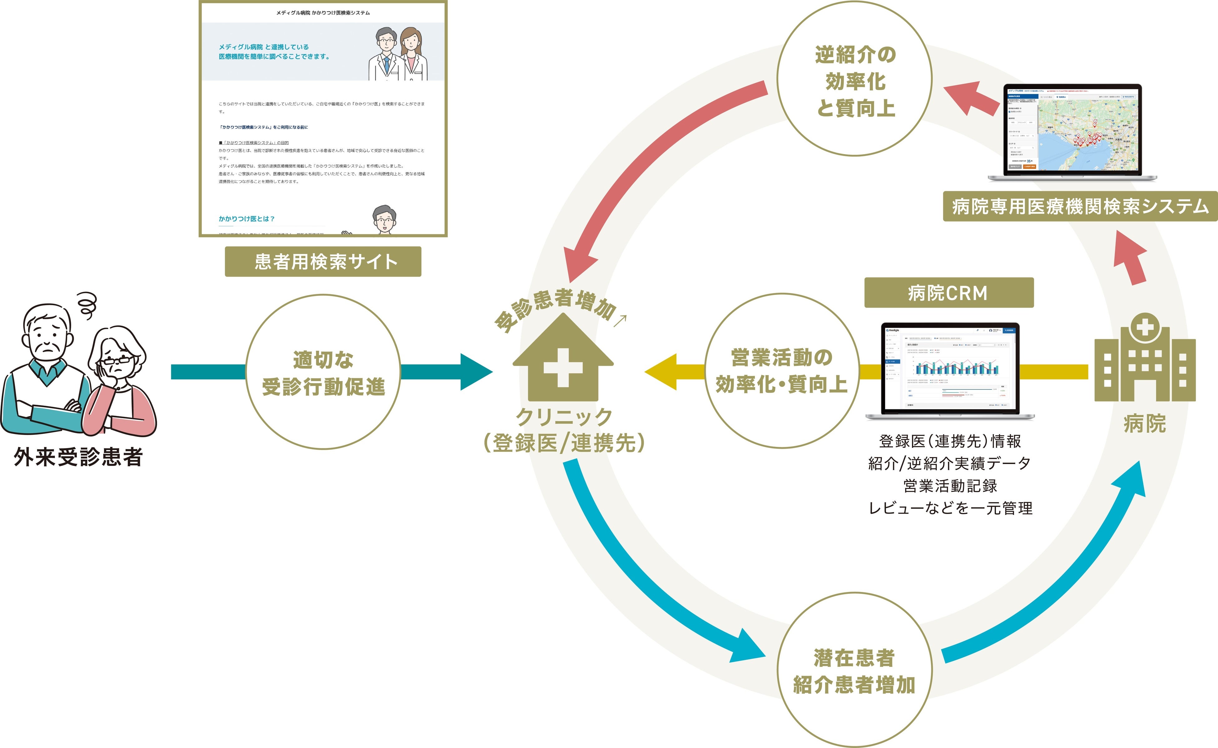 地域医療連携を強化するためには「かかりつけ医の受診促進」・「紹介患者増加」・「逆紹介推進」という病院を取り巻く3つの患者の流れの最適化を図っていく必要があり、「メディグル」はこの最適化を促進させるシステムを提供して参りました。更に、地域医療連携を促進させるためにこの度「メディグル」は3つの新機能リリースを予定しています。