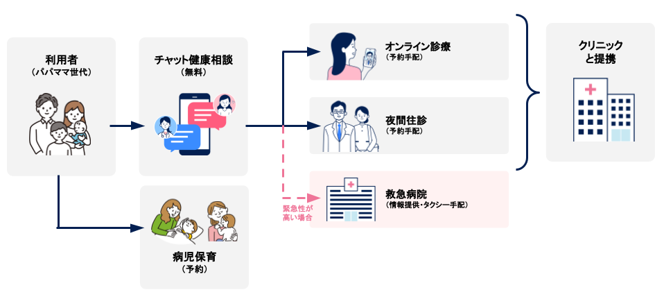 かかりつけのクリニックが開いていない時間に、スマホを通して医師と会話ができるオンライン診療や、患者様のご自宅へ医師が訪問する往診サービスをご予約頂けます。こうした医療サービスは、提携医療機関の医師がご提供するため安心してお使い頂けます(健康保険・こども助成金なども適用可)。