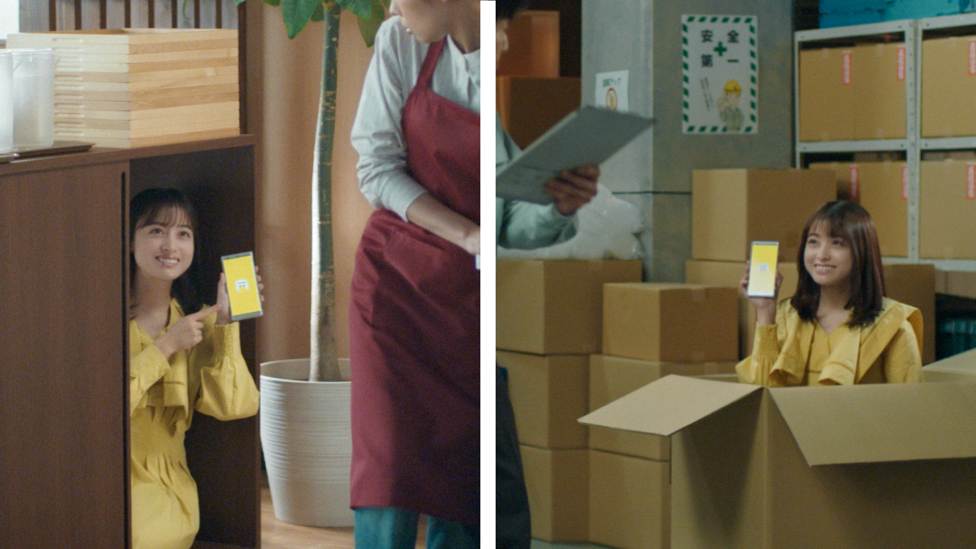本CMでは、「タイミー」ナビゲーター役の橋本環奈さんが颯爽と登場し、求人に悩む事業者を解決に導いてくれます。「タイミー」の「働きたい時間」と「働いてほしい時間」をマッチングする模様をコミカルな演出で描いた作品となっております。CM本編にて、橋本さんが段ボール箱や収納棚の中から“ひょっこり”と現れる演出は、橋本さんにとって初体験の「箱入り娘」姿になっておりますので、ぜひご注目ください。