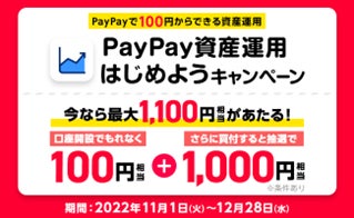 期間中、PayPay資産運用からPayPay証券の口座を開設した方全員にもれなく、PayPay資産運用でご利用いただける100円相当のコース購入代金をプレゼントします。また、さらに1回あたり1,000円以上の買付を行っていただいた方の中から抽選で1,500人に1,000円相当のコース購入代金が付与されます。キャンペーン詳細につきましてはこちら(https://www.paypay-sec.co.jp/campaign/asset/2211.html?utm_source=pressrelease&utm_medium=partner&utm_campaign=ppmini2211&utm_term=PRtimes)をご覧ください。