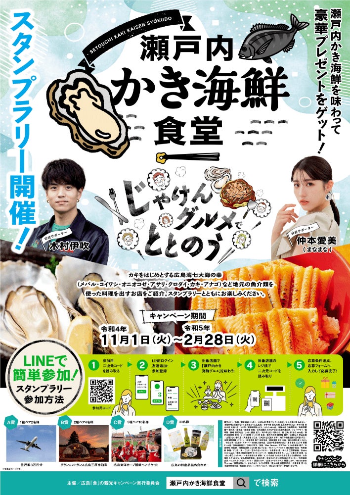 「瀬戸内かき海鮮食堂」スタンプラリーは、地元の魚介類を扱う飲食店を巡る、LINEから参加できるスタンプラリーです。集めたスタンプ数に応じて、旅行券や広島の特産品詰め合わせなどの豪華賞品が当たります。