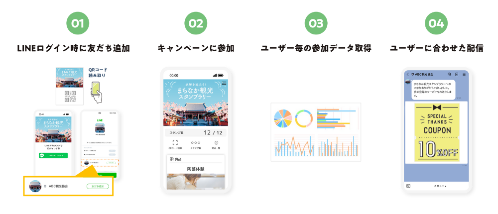 「L-Collect」を利用してLINE上でスタンプラリーを実施すると、参加者の属性や行動履歴などのユーザーデータが蓄積されていきます。キャンペーン終了後も、分析したデータに応じて継続的なアプローチが可能です。自治体が主催するキャンペーンでは、LINE公式アカウントを活用して参加者を友だちとして追加、「地域のファン」の育成と囲い込みができます。