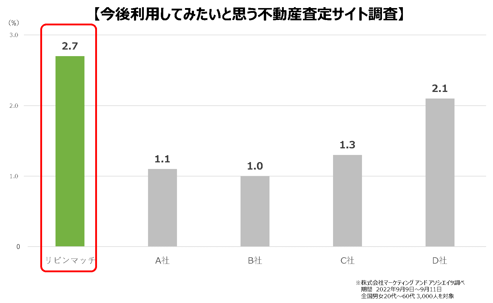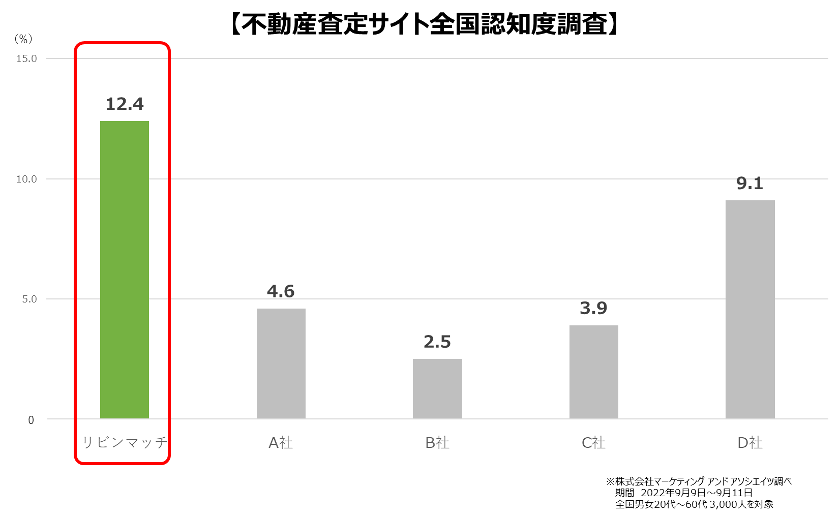 2022年9月9日から9月11日にかけ、当社を含む不動産査定サイト5社を対象とした全国認知度および今後の利用意向に関する調査が実施され、その結果、昨年、一昨年に引き続き、『リビンマッチ』が「不動産査定サイト全国認知度No.1」、「今後利用してみたいと思う不動産査定サイトNo.1」を獲得いたしました。