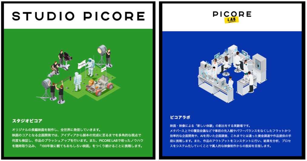 『STUDIO PICORE』では、様々なクリエイターや専門家とともに今までにない制作手法を取り入れ、オリジナルの長編映画を制作し、全世界に発信をしていきます。また、制作過程において、労働基準やコンプライアンスのアップデートを常に行い、クリエイターや観客、社会、多くの方にとって有意義な映画づくりを行っていきます。『PICORE LAB』では、AIを駆使した企画調査や作品の分析、制作過程のシステム化、パワーバランスや先入観を取り払うメタバース上での会議など、制作過程における様々な実験を行います。第一弾の取り組みとして、上田慎一郎が監督をする縦型短編映画を制作し、ショートムービープラットフォーム「TikTok(ティックトック)」にて11月末に公開を予定しています。