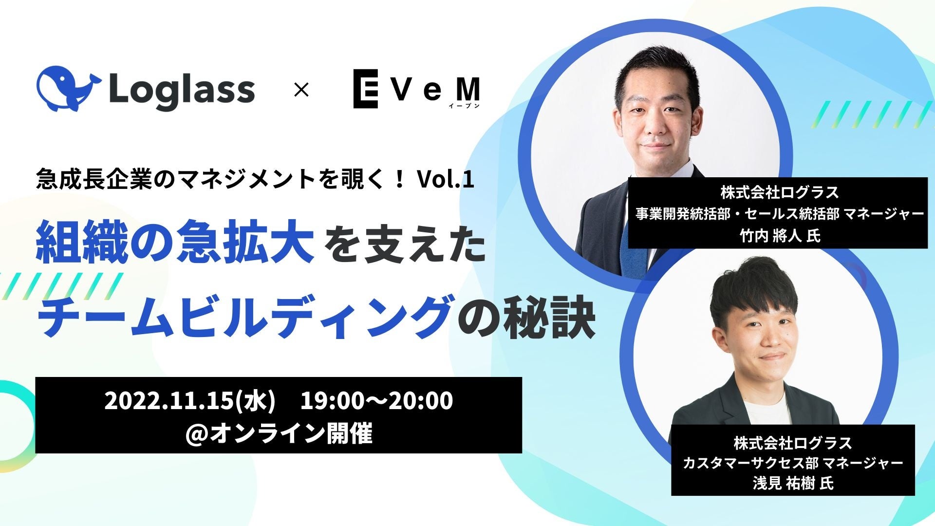 本イベントは、「急成長企業のマネジメントを覗く!」と題し、株式会社EVeMの主催で、社内での「チームビルディング」「マネージャー育成」「経営チーム作り」にスポットを当てて、より強いチームを作っていくための秘訣を深掘っていく企画となります。