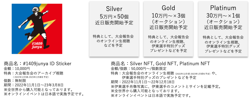これを基に本プロジェクトでは、ID Stickerに加えて、伊東選手のオンラインでの大会報告会イベント( 2022年12月頃-2023年1月頃を予定)に参加できる、伊東選手にまつわるリアルなグッズがもらえる、などの体験が得られるNFTも合わせて展開し、伊東選手とつながりたいファンの気持ちに応えることを目指します。