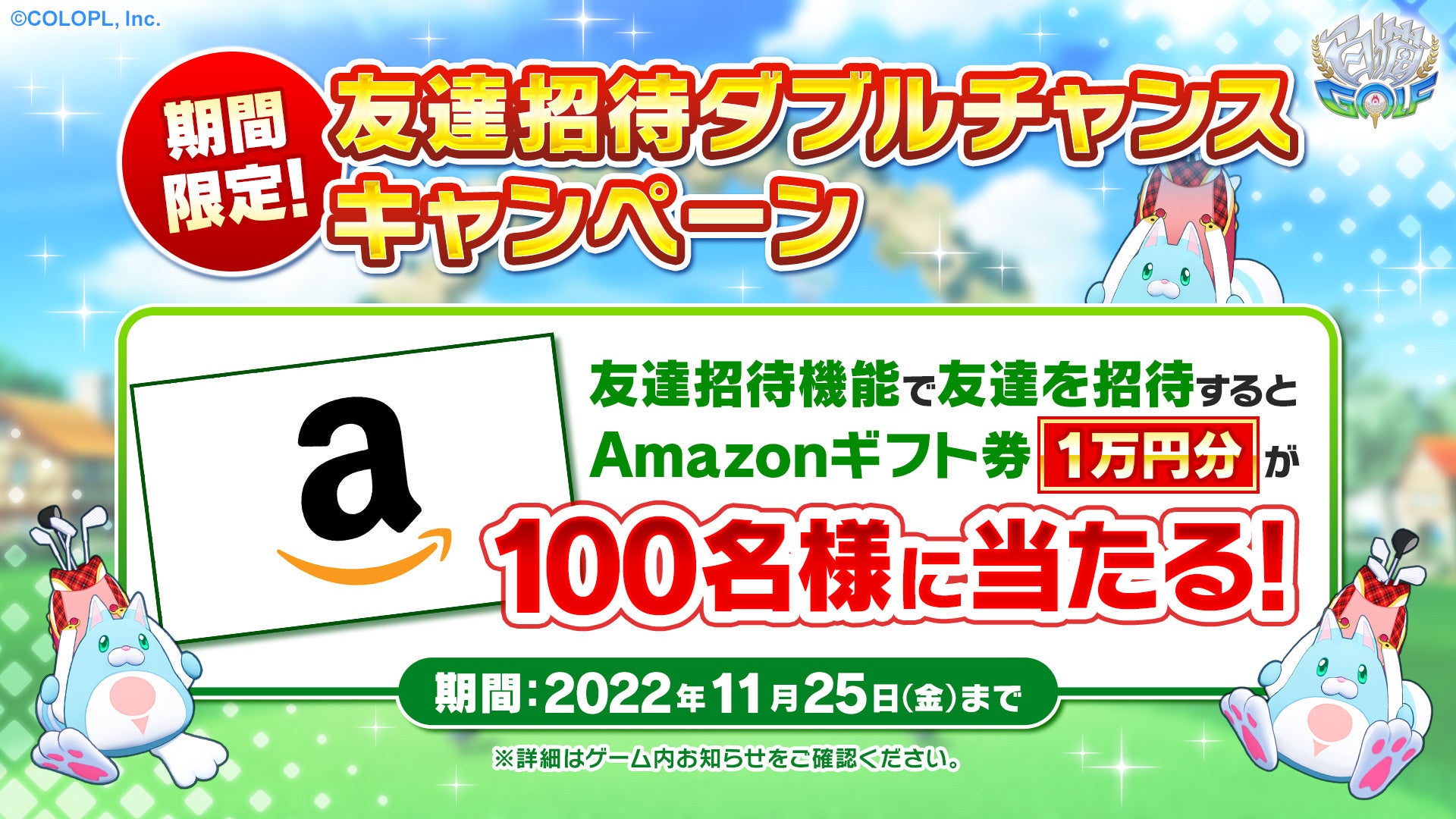 期間中、友達招待機能を利用して『白猫GOLF』に友達を招待すると、抽選で100名様に「Amazonギフト券1万円分」が当たるキャンペーンを開催しております。招待した人数に応じて当選確率がアップしますので、ぜひたくさん誘って一緒に『白猫GOLF』をお楽しみください。