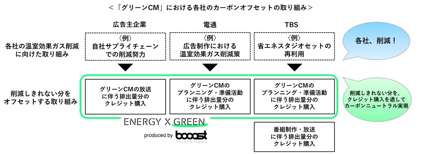 NET-ZEROリーダーが選ぶカーボンマネジメントプラットフォーム『ENERGY X GREEN』( https://green.energyx.jp/ )を展開するClimate Techカンパニーbooost technologies株式会社(東京都品川区、代表取締役:青井宏憲 以下 当社)は、株式会社電通(東京都港区、代表取締役社長執行役員:榑谷典洋 以下 電通)と株式会社TBSテレビ(東京都港区、代表取締役社長:佐々木卓 以下TBS)が共同で提供を開始するテレビCM「グリーンCM」のCO2等排出量の算出および排出量分のJ-クレジット(再生可能エネルギー由来)による脱炭素化を『ENERGY X GREEN』を用いて実施し、テレビCMに伴う排出量のオフセットを実現します。