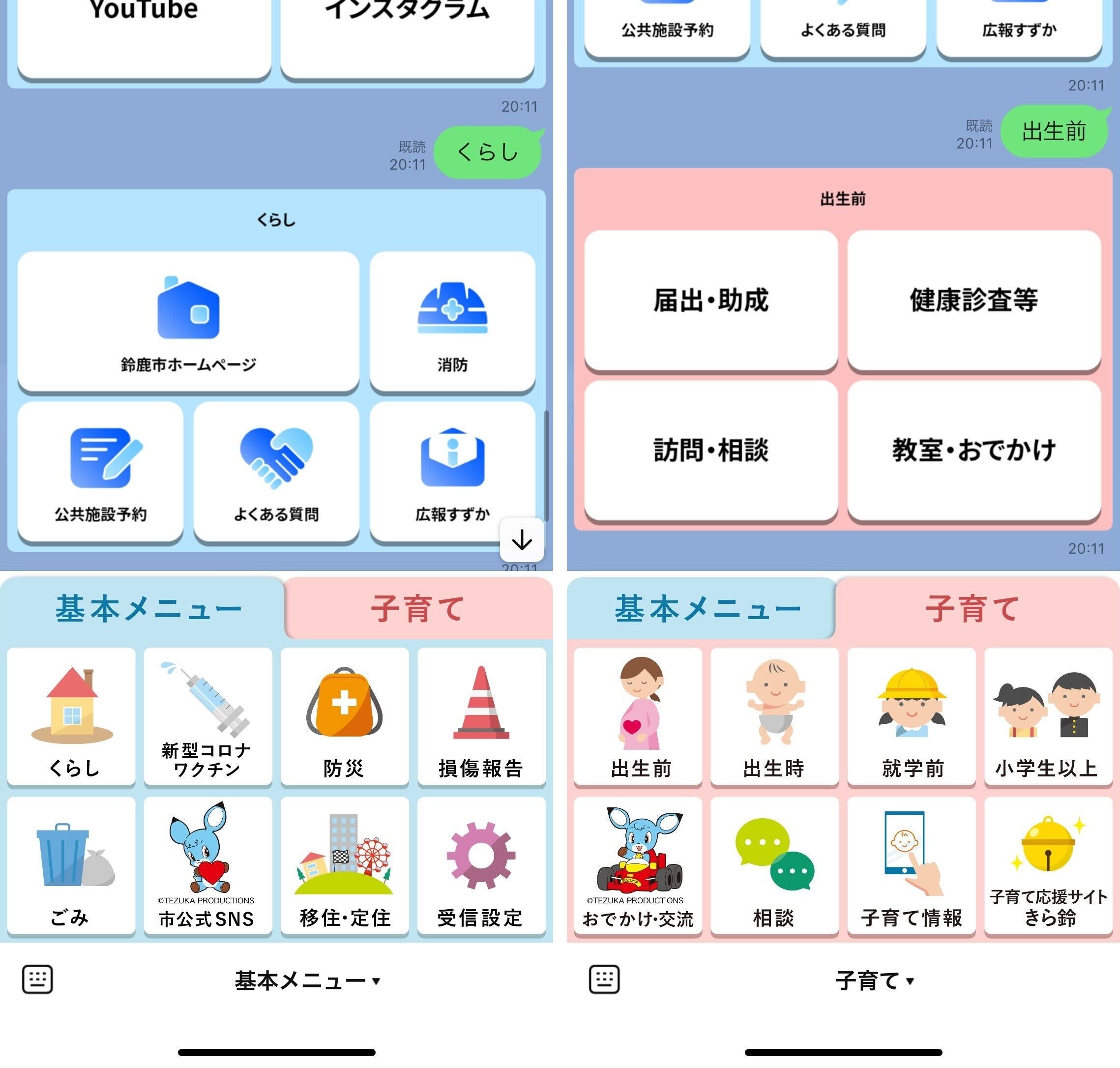 タブ化にも対応しており基本メニューでは、ごみやコロナ、損傷報告などくらしに関わる情報を発信。もう一方のメニュータブでは子育てに関する様々な情報を発信しLINEを通じた便利で役立つサービスの拡充に取り組んでいます。