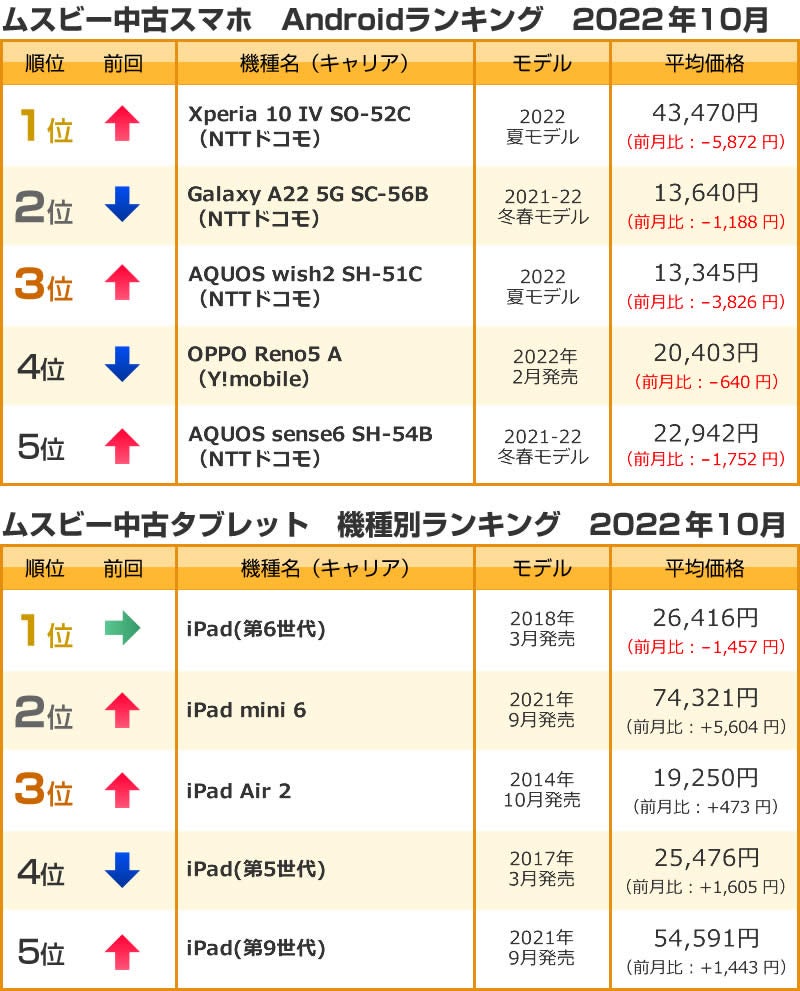 売上順位 / 機種名(キャリア)/ 平均価格※(前月比)