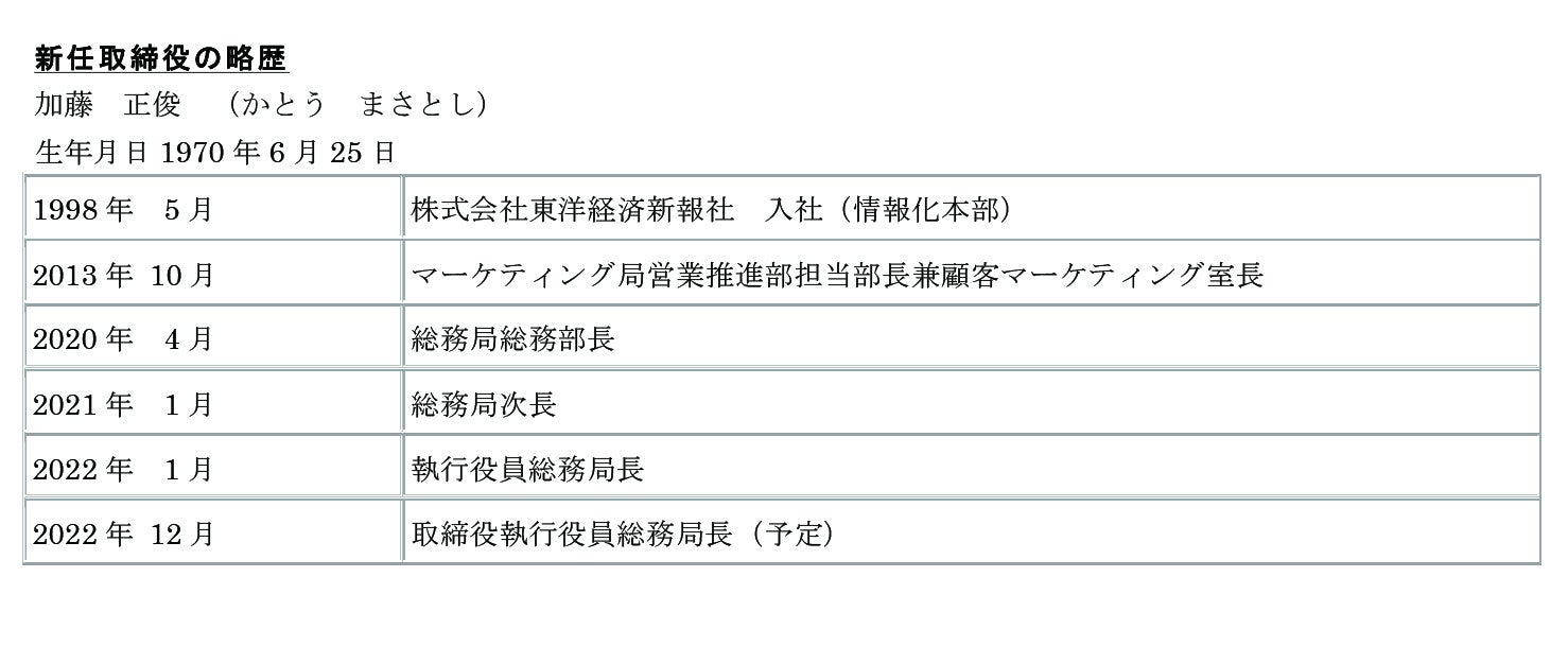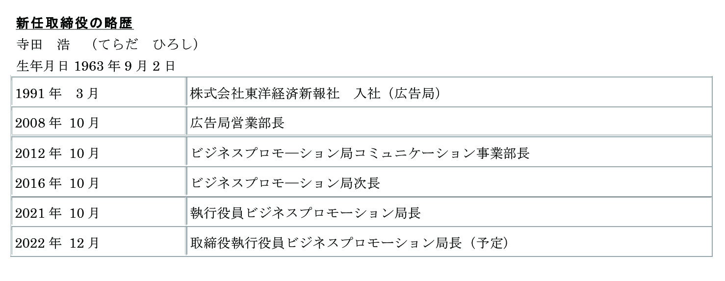 東洋経済新報社の取締役等選任について it Twitter Facebook はてブ Pocket LINE コピー 2022.11.01 この記事は約1分で読めます。 株式会社東洋経済新報社(本社 東京都中央区、代表取締役社長 駒橋憲一)は、2022年11月1日開催の取締役会において、第131期定時株主総会(2022年12月22日開催予定)に付議する取締役等選任議案の候補について内定いたしましたので、ご報告申し上げます。