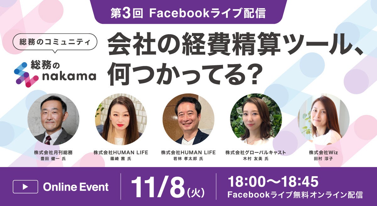 第1回、第2回の「総務のnakama(ナカマ)」Facebookライブでは、パネリストをオンラインで繋ぎ「総務の役割」や「連絡ツール」などについて具体的なエピソードを交えて語り合いました。第3回目は、より一層活発に議論すべくパネリストがオフラインで集い、「会社の経費精算ツール」をテーマに座談会形式で開催します。