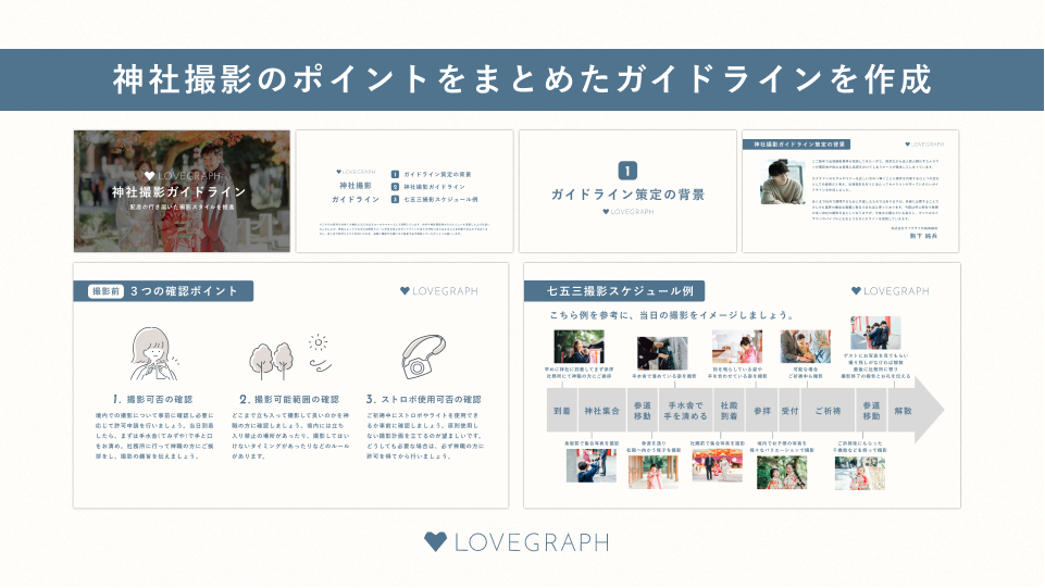 出張撮影サービス「ラブグラフ」は2015年にスタートし、5万組を超えるお客様の思い出を撮影させていただいてきました。これまでの様々な撮影や研修の経験を活かし、この度、神社で撮影する際のポイントをまとめた『神社撮影ガイドライン』を公開いたしました。