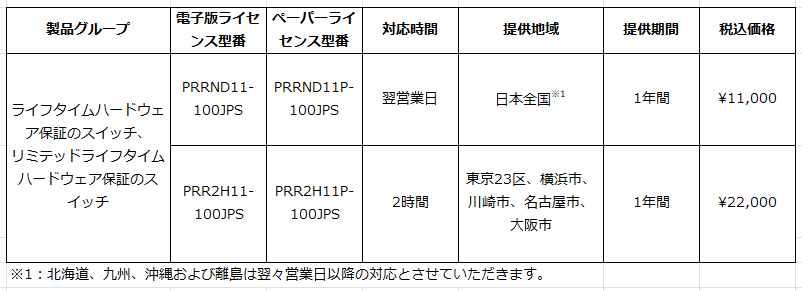 ライフタイムハードウェア保証のマネージスイッチ製品、およびリミテッドライフタイム保証のスイッチ製品に対して、製品購入後6年目以降もクイックデリバリーサービスをご購入いただけます。ただし、リミテッドライフタイムハードウェア保証のスイッチ製品はハードウェア保証期間を上限といたします。