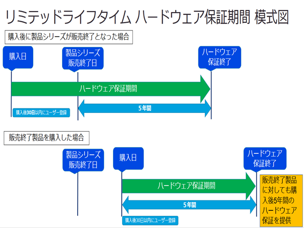 ただし、製品シリーズ販売終了後に対象シリーズ製品を購入された場合でも、製品ご購入日から5年間の長期ハードウェア保証をいたします。