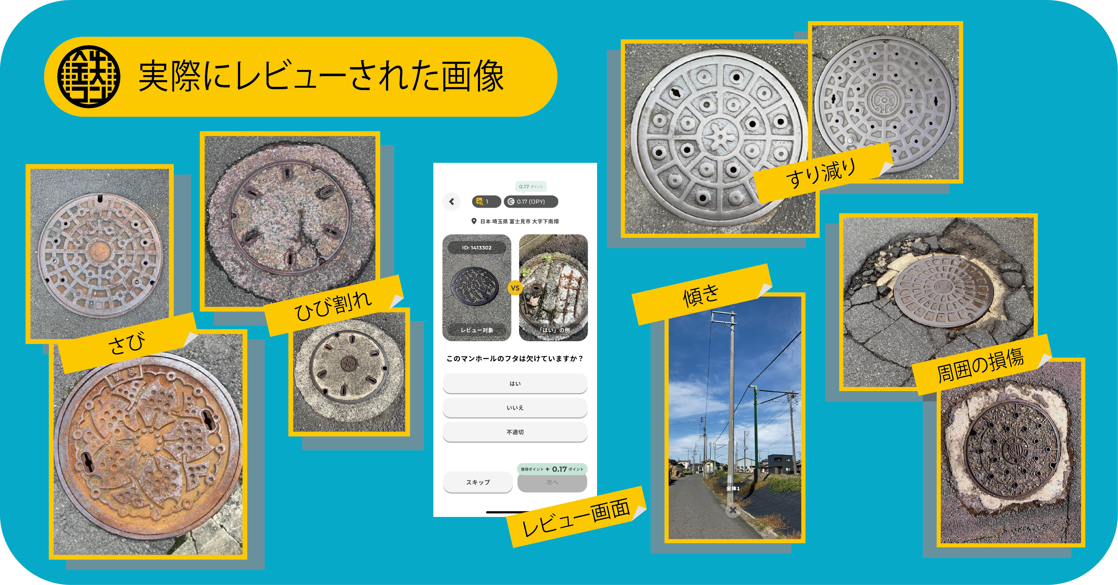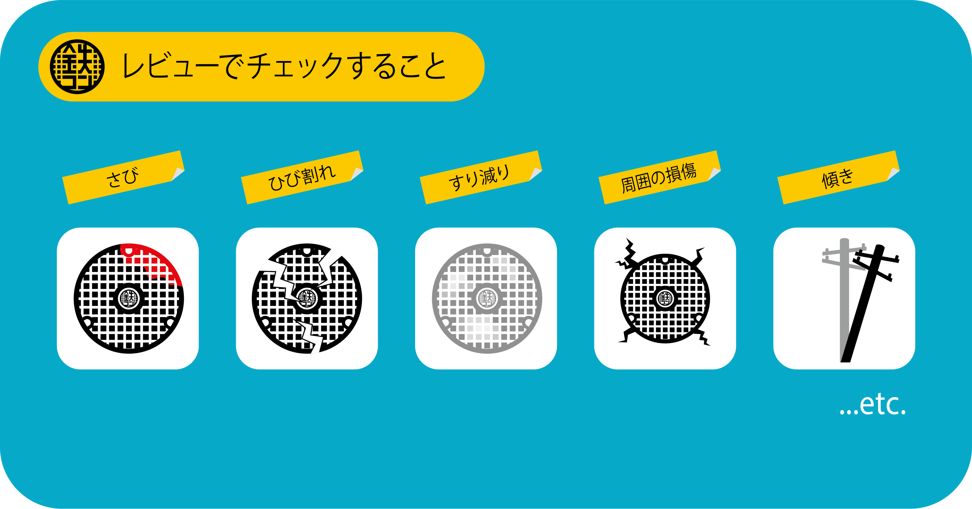 身近にあるインフラを「撮影・投稿」、投稿されたデータを「レビュー」することで精度の高いデータとなります。その後、収集されたデータはインフラ企業や自治体のもとに渡り、補修・交換が必要な箇所を効率的に判別することができます。