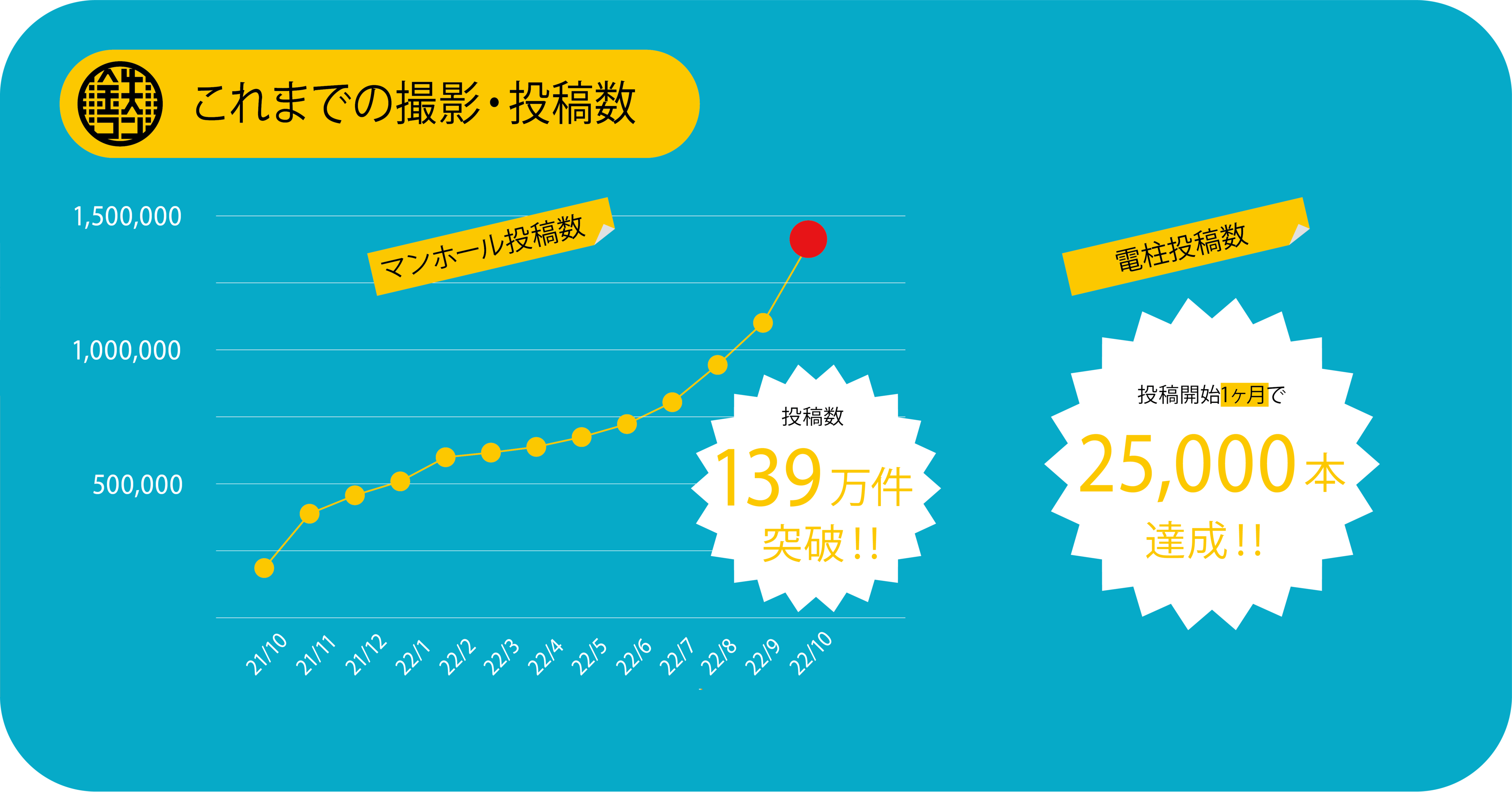 リリース時にはマンホールのみが撮影対象でしたが、10月1日に電柱も新たに追加。身近な場所にあるマンホールを撮影し終えたシチズン(市民)たちは電柱のデータを集めています。現在は、マンホールは139万枚以上、電柱は1ヶ月で既に25,000本以上のデータが投稿されています。