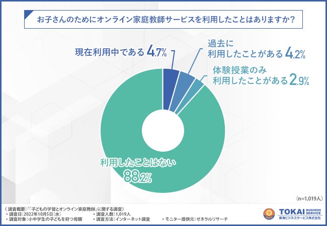 「お子さんのためにオンライン家庭教師サービスを利用したことはありますか?」と質問したところ、『現在利用中である(4.7%)』『過去に利用したことがある(4.2%)』『体験授業のみ利用したことがある(2.9%)』『利用したことはない(88.2%)』という回答結果になりました。