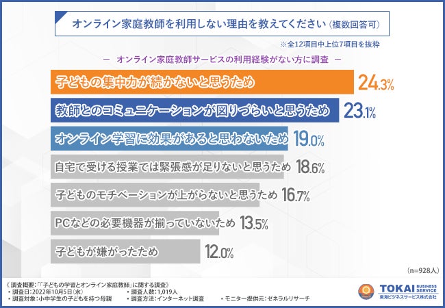 オンライン家庭教師を利用していない理由として、子どもの集中力が続かないのではと不安に思っている方が多いことが明らかになりました。