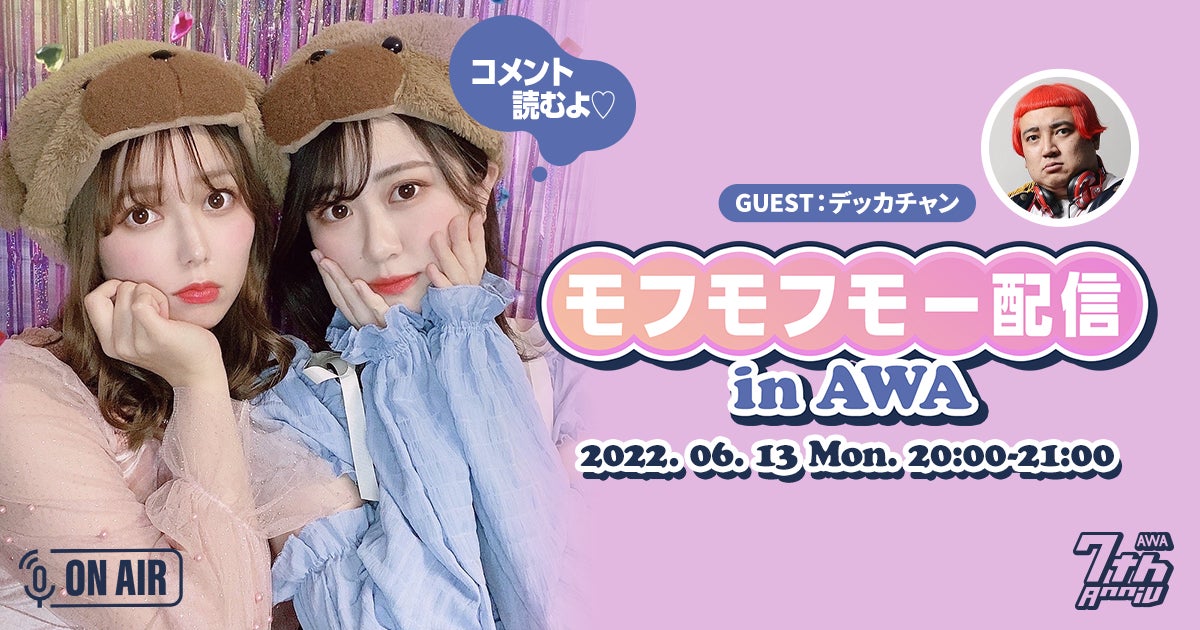 今回のイベントは、モAWA7周年を記念して開催されるもので、モフモフモーとも親交の深い、デッカチャンをゲストに迎え、リラックスした雰囲気でお送りする生音声配信トーク番組になります。LOUNGEは、どなたでも無料で参加することができ、AWAアプリを事前にダウンロードしていれば、アーティストとの交流など、よりお楽しみいただけます。ぜひ、モフモフモーのラジオ配信ラウンジをお楽しみください。