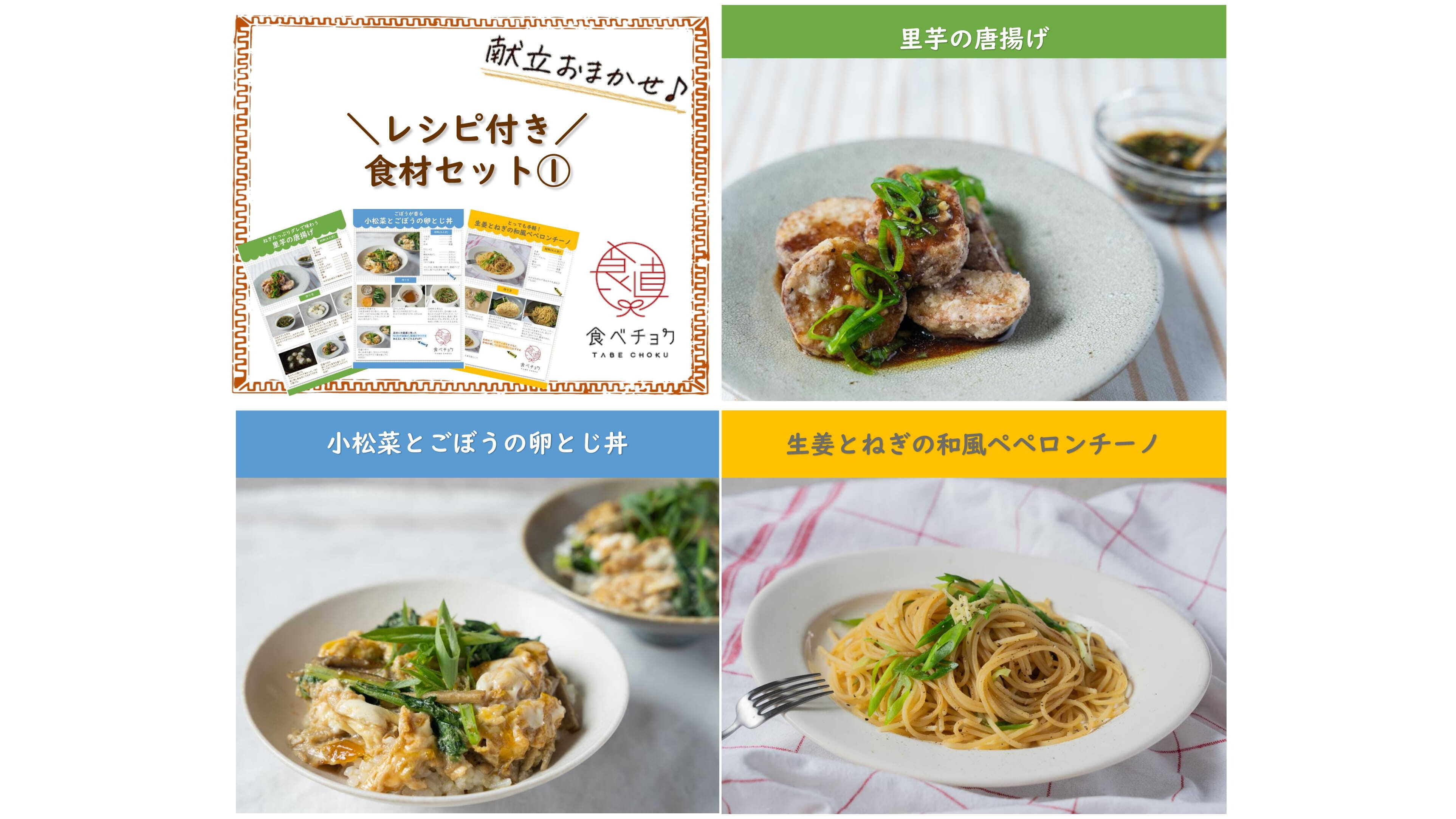 ・レシピ内容:里芋の唐揚げ、小松菜とごぼう卵とじ丼、生姜とねぎの和風ペペロンチーノ