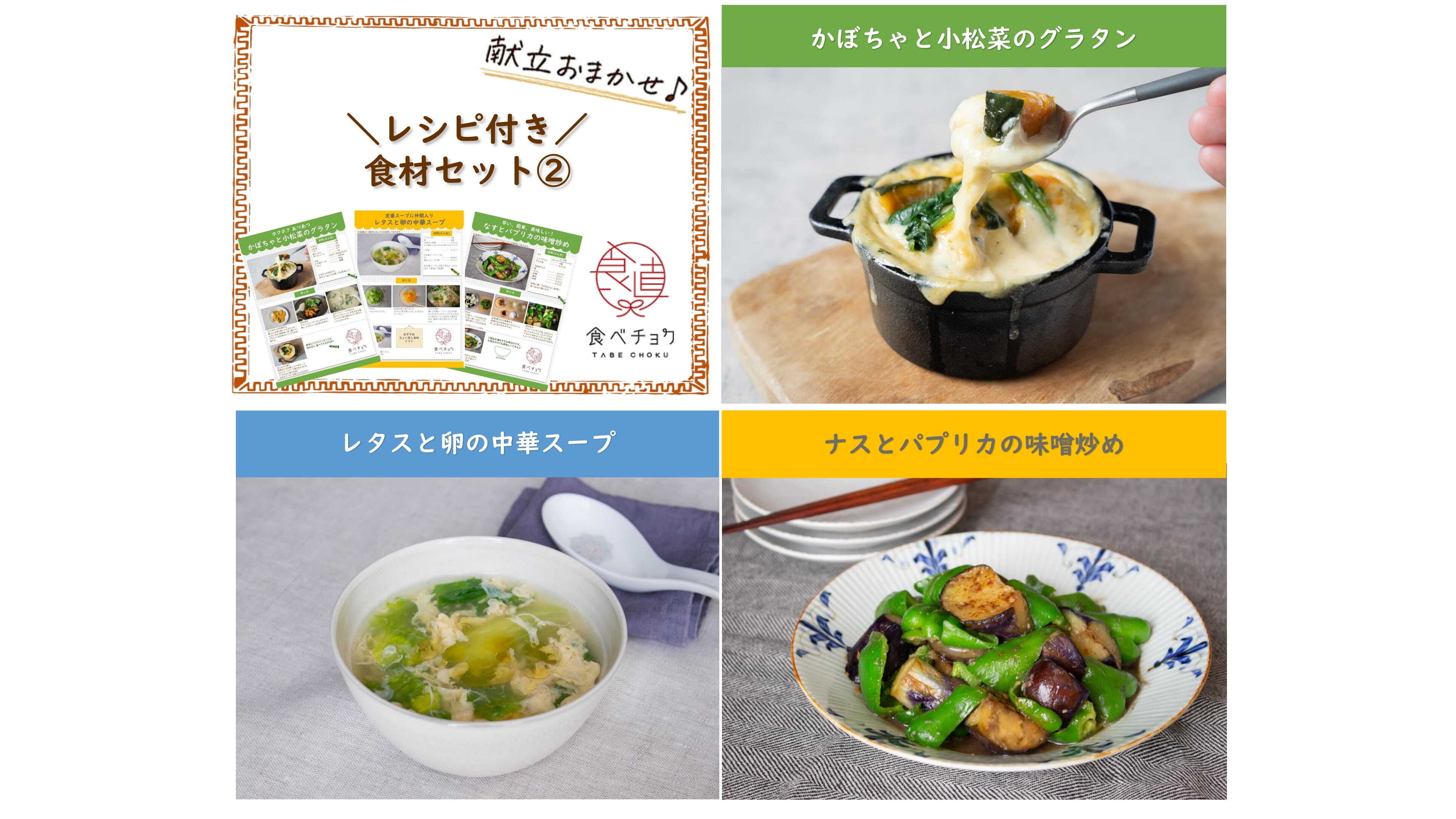 ・レシピ内容:かぼちゃと小松菜のグラタン、レタスと卵の中華スープ、なすとパプリカの味噌炒め