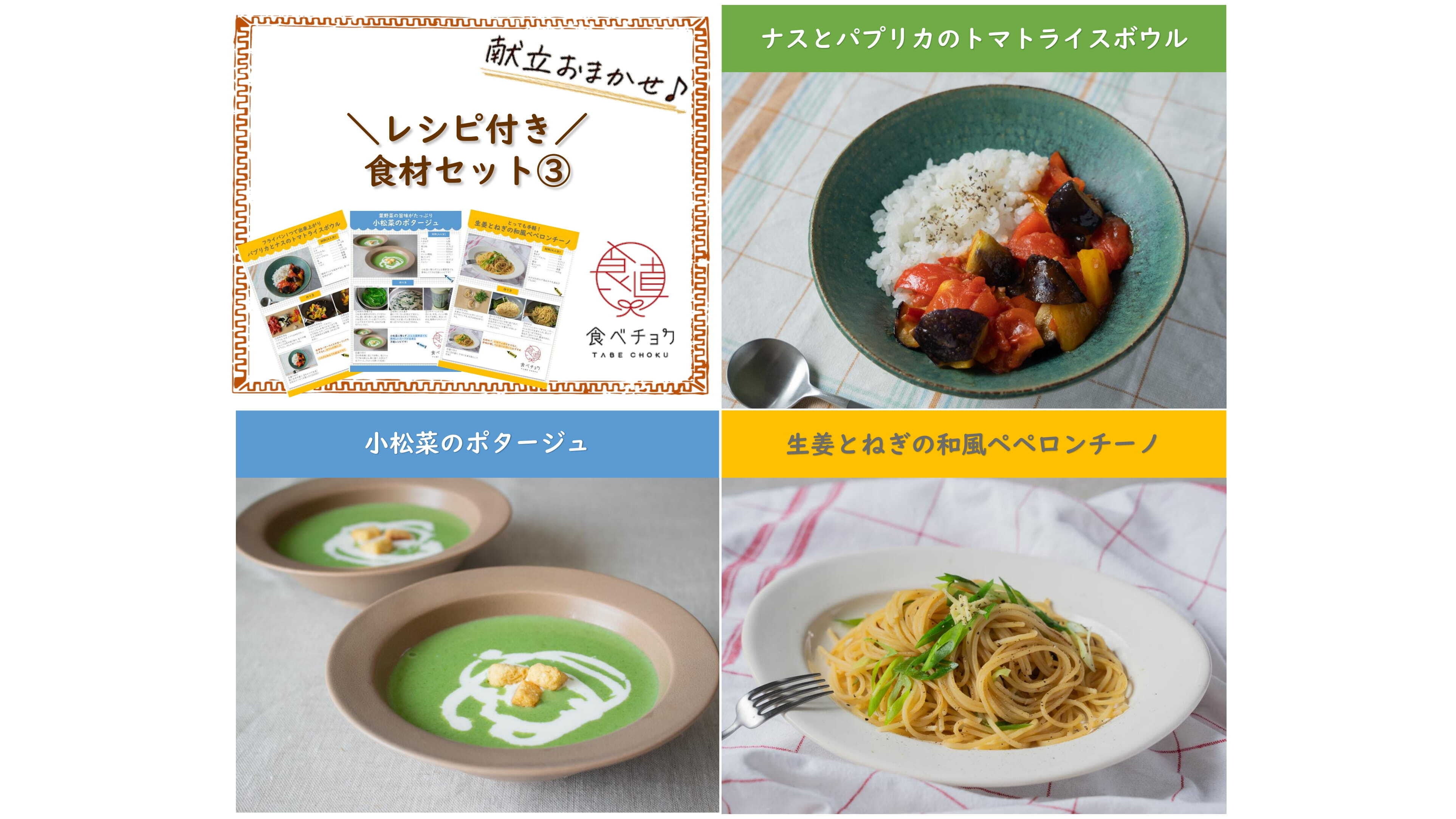 ・レシピ内容:パプリカとなすのトマトライスボウル、生姜とねぎの和風ペペロンチーノ、小松菜のポタージュ