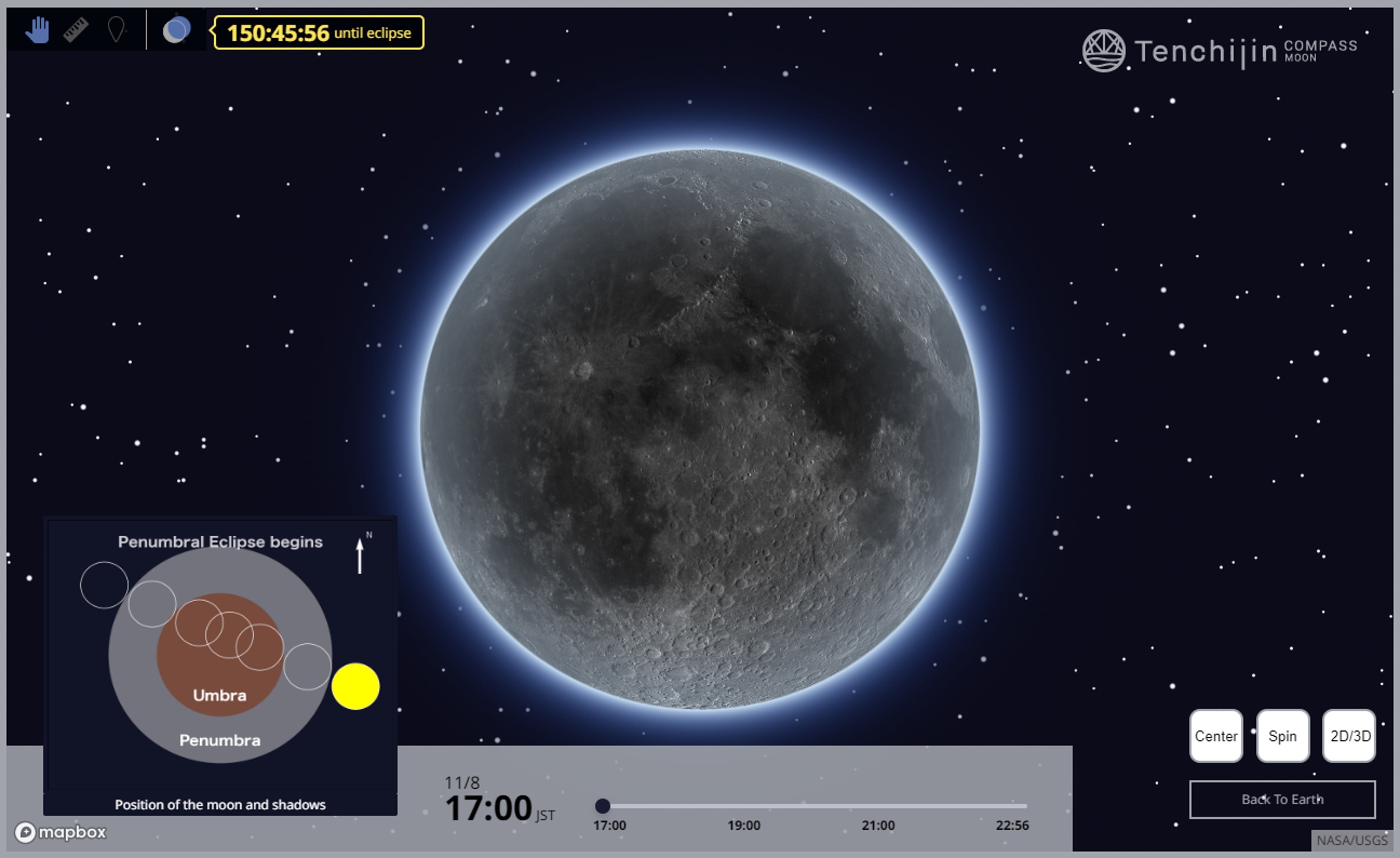 天地人コンパス MOON は、11月8日の皆既月食を、月食前・月食中・月食後のタイミングでお楽しみいただけます。無料、かつ、アカウント登録なしでご使用いただけますので、皆既月食に合わせてぜひご体験ください。