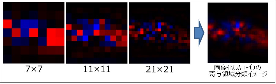 (2)元の画像と生成したマスク画像を画像分類AIに読み込ませ、対象となる分類の確信度の大きさの変化を求める。マスクすることにより確信度が下がる格子は「正の寄与部分」として赤く塗り、上がる箇所は「負の寄与部分」として青く塗る。塗った色の明るさ(輝度)は、確信度の変化の大きさを表す。すべての格子に対してこの操作を行い、画像を生成する。