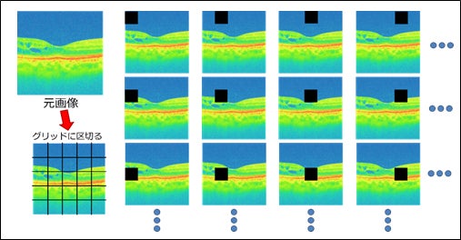 (1)診断画像を格子(グリッド)状に区切り、区切った一部分をマスクした画像を複数生成する。