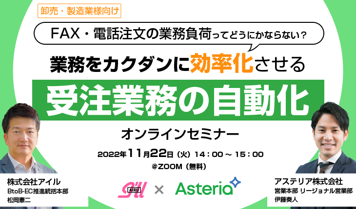 企業向け業務管理システム開発・提供の株式会社アイル(本社:大阪市北区・東京都港区、代表取締役社長:岩本哲夫、証券コード:3854)と、アステリア株式会社(本社:東京都渋谷区、代表取締役社長:平野洋一郎、証券コード:3853)は、2022年11月22日(火)に、受注業務の煩雑さに悩む事業者さまに向けて、「FAX・電話注文の業務負荷ってどうにかならない?業務をカクダンに効率化させる“受注業務の自動化”オンラインセミナー」を無料開催します。