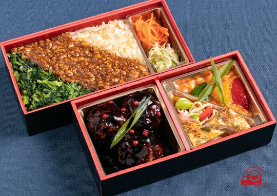 黒酢酢豚は食べて驚き、中に3種の具材を巻き込んだミルフィーユ仕立てです。黒酢あんとの絶妙なコンビネーションをお楽しみください。ごはんのお重は、ごはんと一体感が出るよう仕上げたくずし麻婆豆腐をメインにした中華風ビビンバです。蓋をあけてから最後まで目と舌とでお楽しみいただけるようこだわりをつくしたお弁当です。