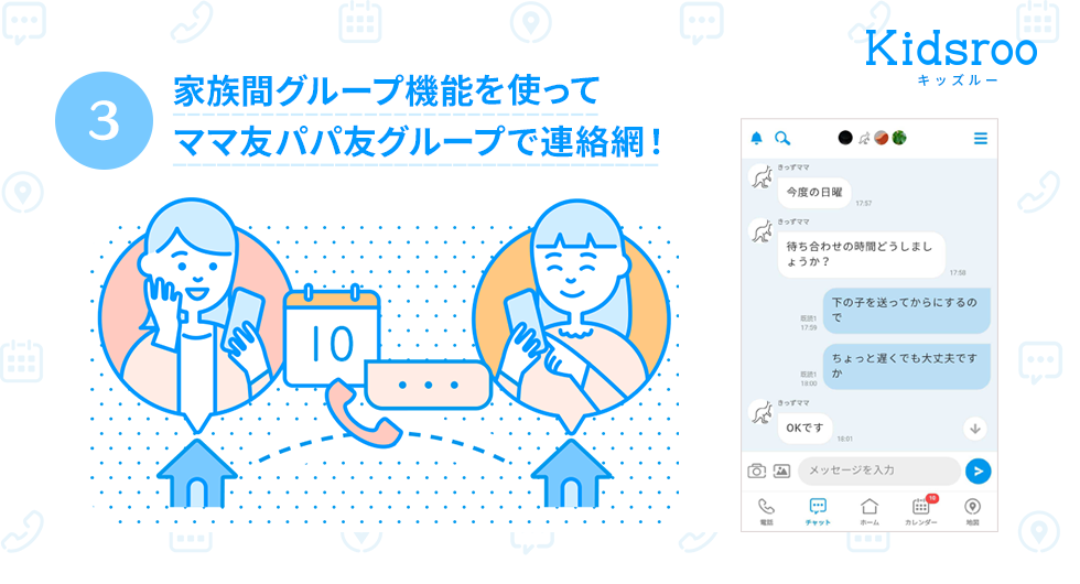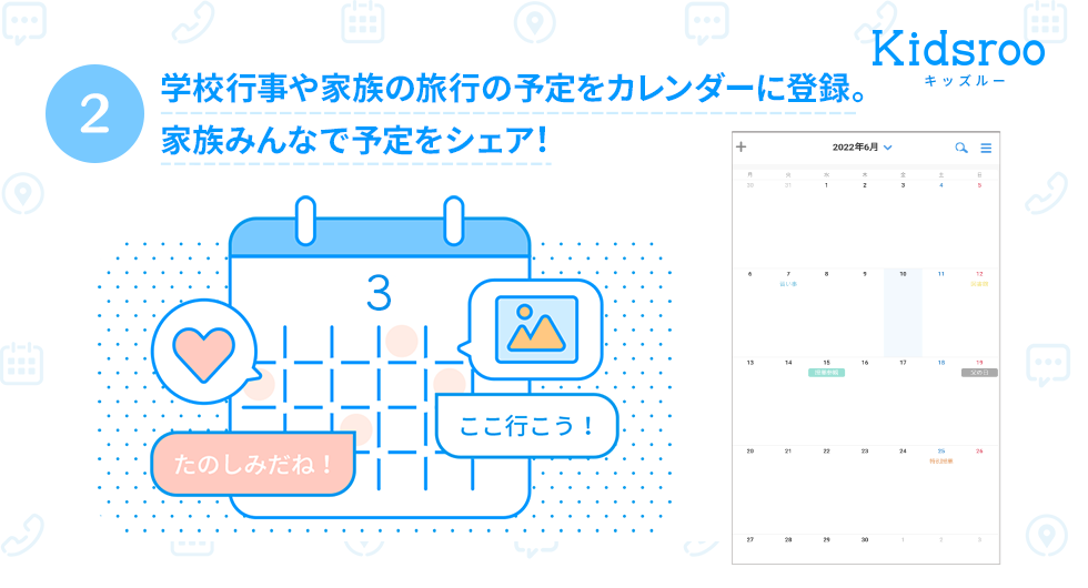 Kidsrooアプリには家族同士で予定を共有しあえるカレンダー機能があります。子供の学校の予定や家族で計画した旅行の予定などプライベートなスケジュールを家族だけで共有しあえます。