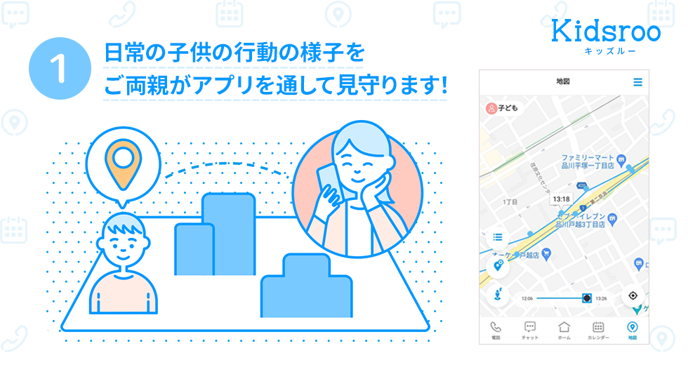 Kidsrooアプリを搭載したスマホを子供が持って移動するだけで、ご両親のアプリ上でリアルタイムに子供の居場所が表示されます。学校の登下校、塾や習い事・部活、お友達と遊びに出かける様子など、子供の日々の行動の様子を見守ることができます。
