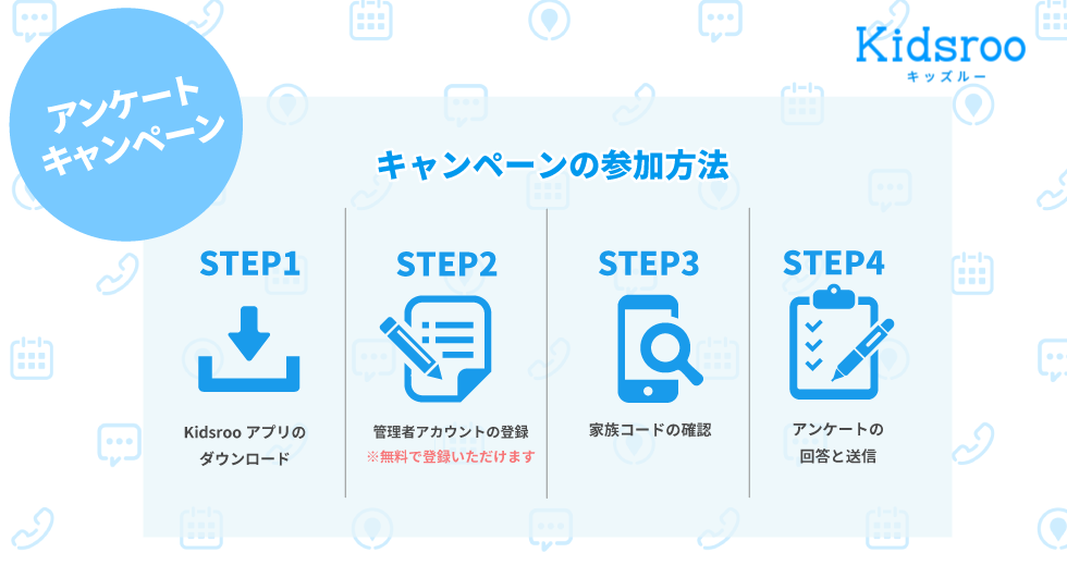 Kidsrooのアプリをダウンロードし、管理者の登録をしていただくとアンケートに参加いただけます。