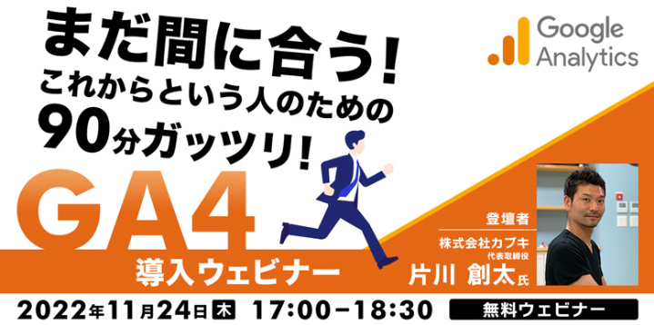 今回のウェビナーでは、メディア事業やWebコンサルティング事業等を展開する株式会社カブキの代表取締役・片川 創太氏にご登壇いただき、GA4に関する予備知識やユニバーサル版との違い、初期設定への理解などについて解説していただきます。導入方法がわからない方やユニバーサル版との違いにお悩みの方など、ご興味をお持ちの方はぜひご参加ください。