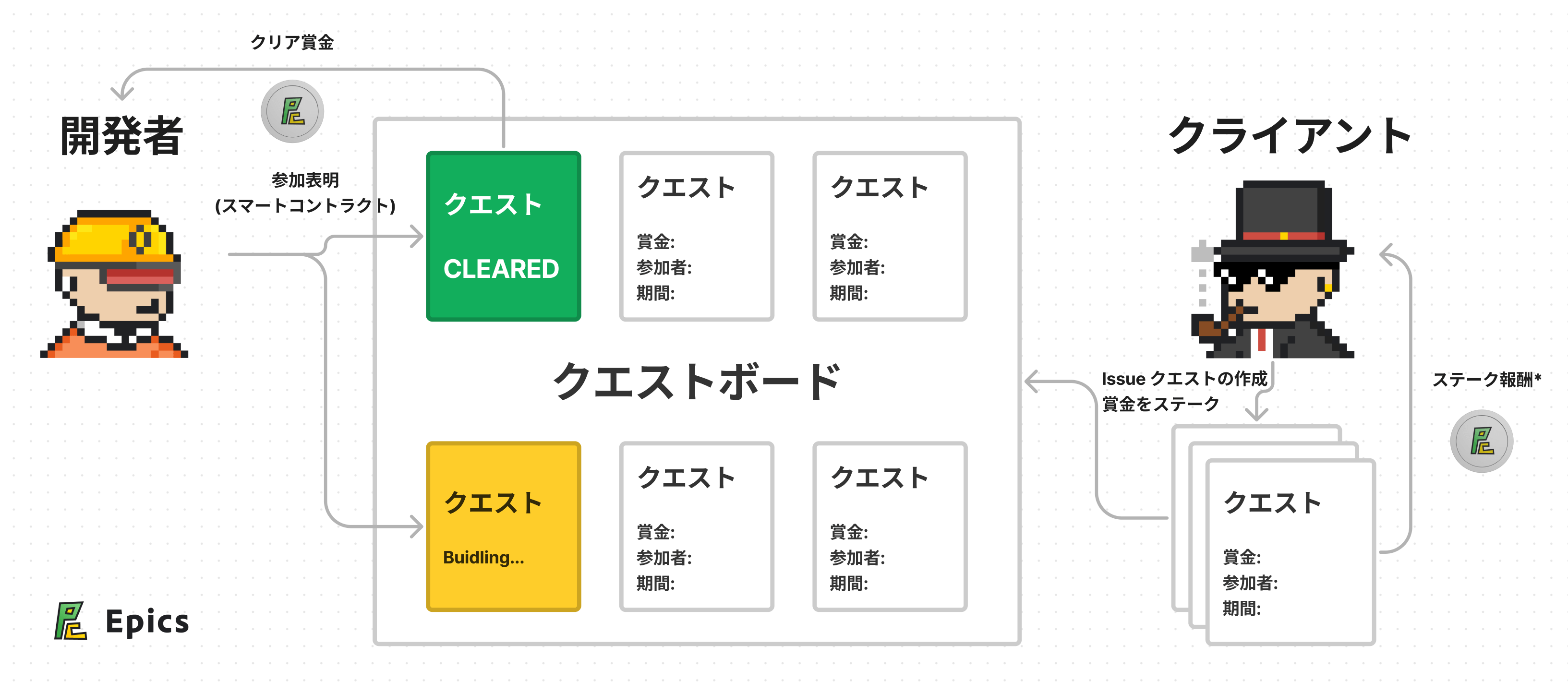 依頼者は GitHub issue を懸賞クエスト(スマートコントラクト)として公開し、開発者を募集できます。 開発者は懸賞クエストに参加し、クリア(issue の解決)することで賞金(トークン)を受け取ることができます。