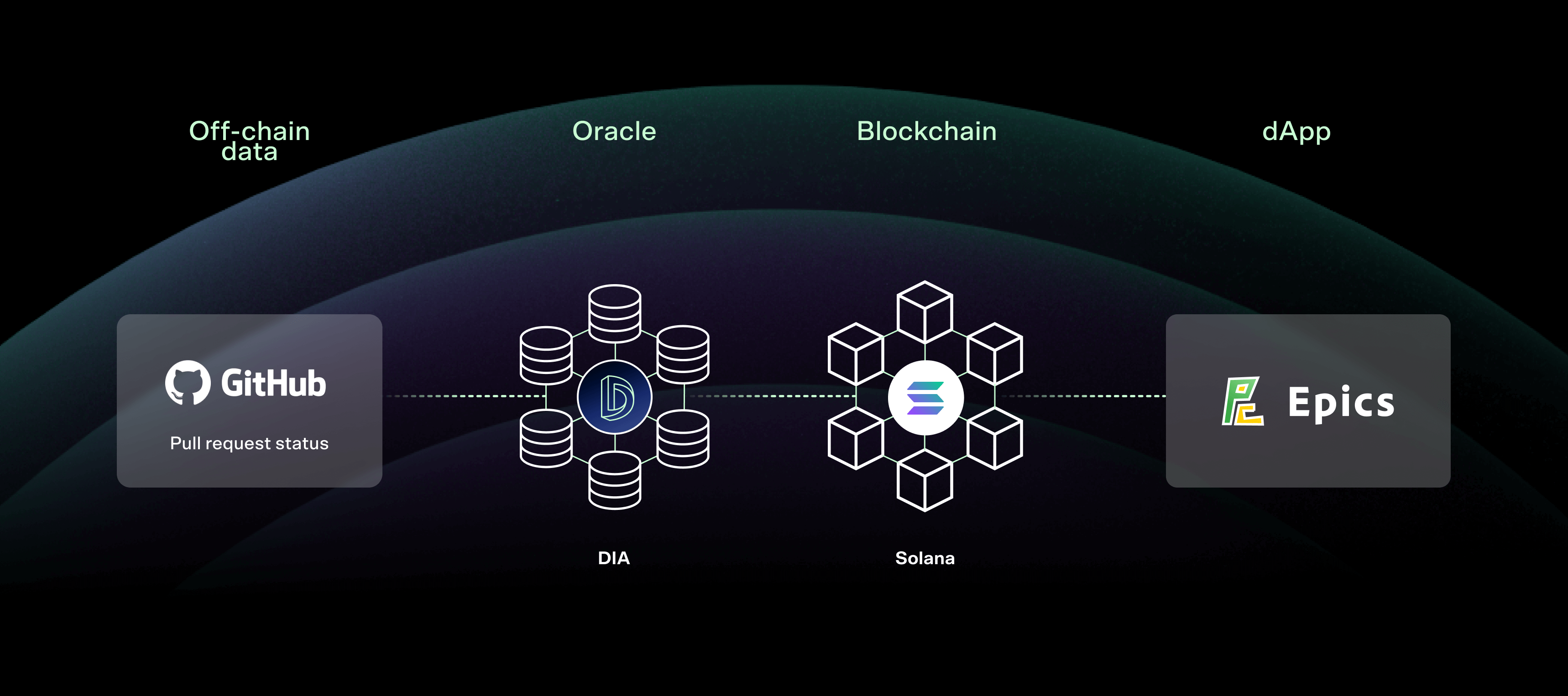 DIA の提供するオラクルは、GitHub プルリクエストのステータス (オフチェーンデータ) と Solana 上の Epics のプロトコル (オンチェーン) の間の自動接続を提供し、分散型クラウドソーシングプラットフォームの円滑な開発を可能にします。
