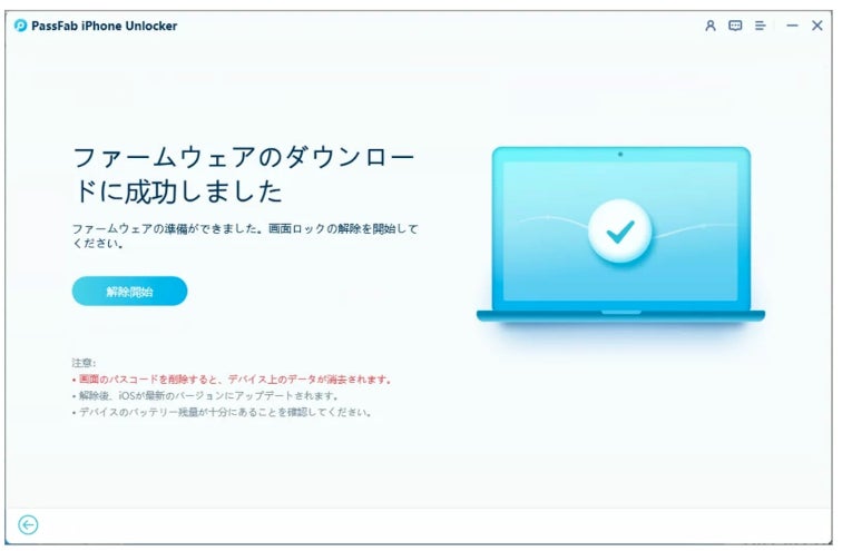 Step4:ファームウェアのダウンロードが完了したら、「解除開始」をクリックしてパスワードの解除を開始します。数秒で解除できます。