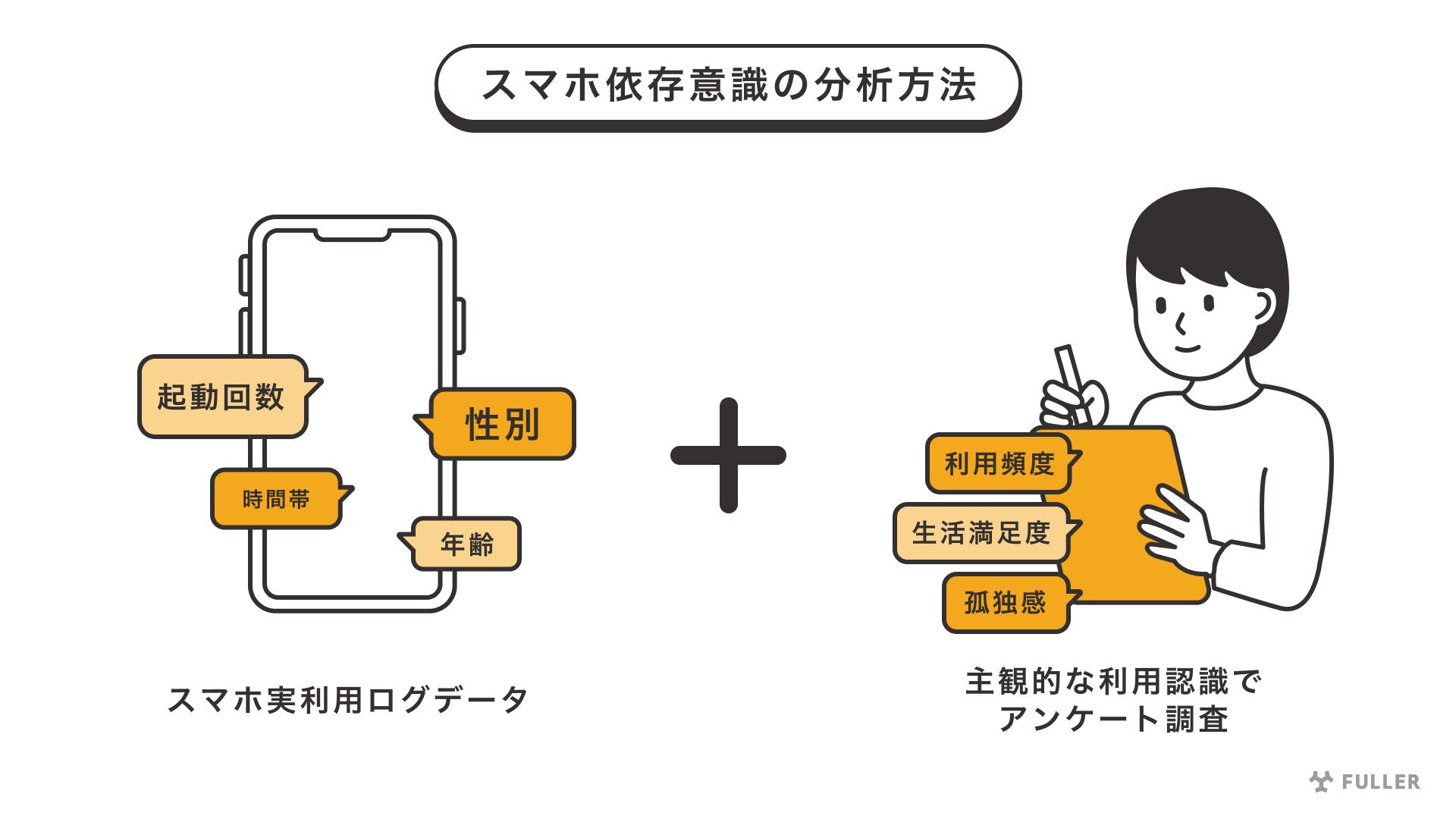 これはLDASU(Log Data Analysis of Smartphone Use)研究プロジェクトと称したスマートフォンの実利用ログデータ分析による共同研究の一つです。スマートフォンが日常生活に深く浸透している現代社会において、過度なスマートフォン利用等による、精神的健康への影響への関心が高まっています。このような社会的課題に対して、従来の情報行動研究では、アンケート調査による主観的利用認識、態度のデータにもとづく分析が行われていますが、スマートフォンの実利用ログデータと精神的健康との関係について、日本社会を対象とした調査は、いまだほとんど見られません。そこで、本研究は、LDASU研究プロジェクトの一環として、フラー株式会社が事前に承諾を得たAndroidスマートフォン利用者600人余りの153日間に及ぶ実利用ログデータとウェブアンケート調査の回答を組合わせることで、スマートフォン依存意識が何に因るのかを探索的に分析しました。