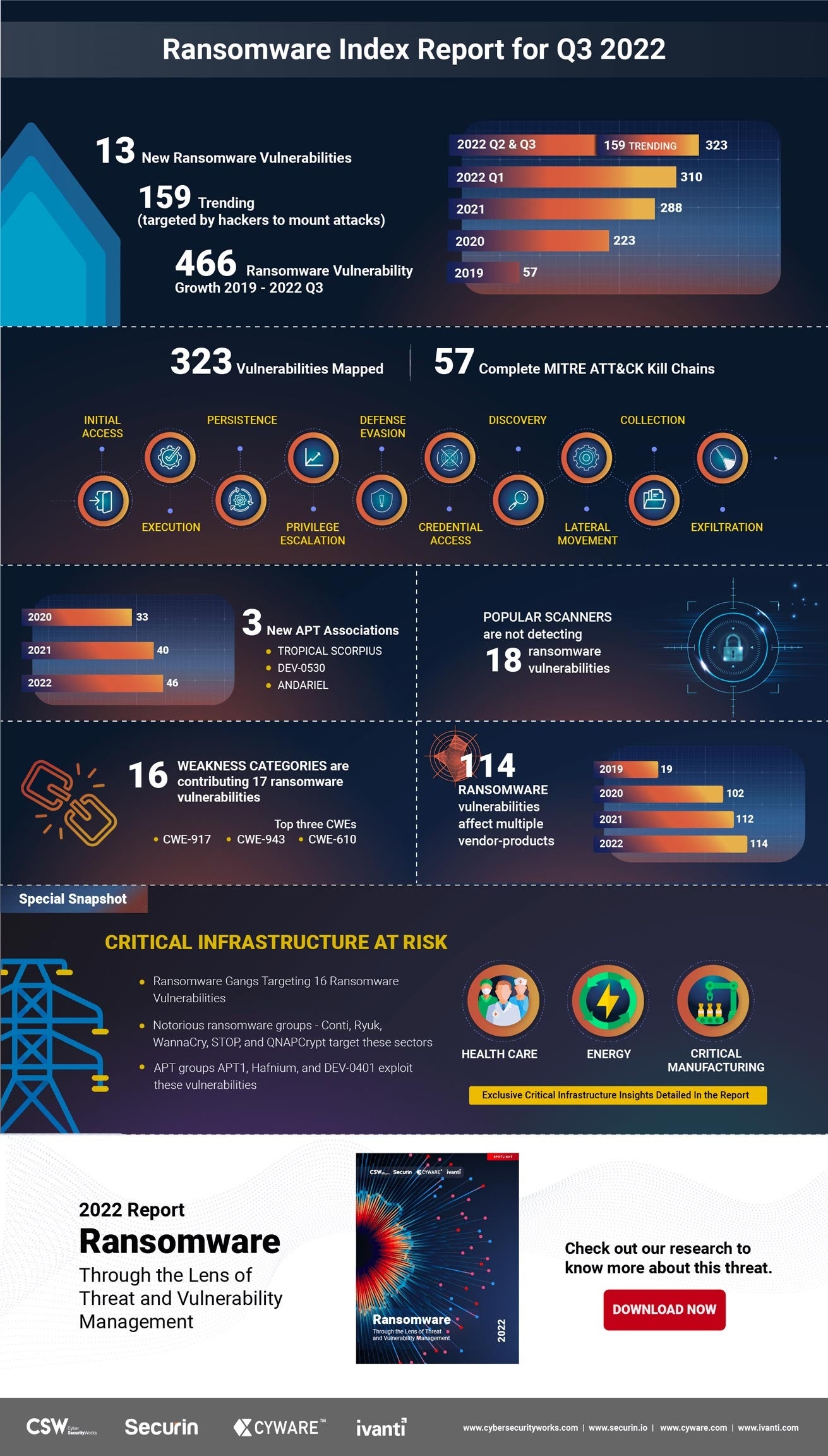 クラウドからエッジまで IT 資産の管理、検出、保護、サービスを自動化するプラットフォーム Ivanti Neurons を提供する Ivanti(本社:米国ユタ州ソルトレイクシティ、CEO:Jeff Abbott)は本日、CNA(CVE採番機関)のCyber Security Works、サイバーフュージョンセンター構築テクノロジープラットフォームの リーディングプロバイダーCywareとともに実施した「ランサムウェア インデックスレポート Q2-Q3 2022 」の結果を発表しました。 本レポートによると、ランサムウェアは2019年から466%増加しており、ウクライナとロシアの紛争やイランとアルバニアのサイバー戦争に見られるように、実際の戦争の前兆として利用されるケースが、加速的に増大していることが明らかになりました。(参考資料: https://cybersecurityworks.com/blog/vulnerabilities/cyberwar-bulletin-iran-and-albania.html )