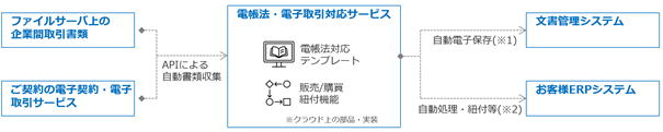 当社で実績のある電帳法対応テンプレートを活用し、全社で利用できる文書管理システムを短期間で整備します。テンプレートの活用により、文書の階層構造や権限処理、検索項目等を漏れなく定義し、システム連携にて自動チェック・電子保存(図中※1)することが可能です。