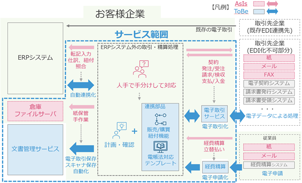 現状、紙・FAX・メール等で処理している販売/購買業務について、電子取引システムを導入し、電子化を実現します。また、当社の販売/購買紐付機能により、面倒な「見積と受注の紐づけ」や「請求と発注の紐づけ」まで自動化(図中※2)が可能です。また既にお使いの電子取引システムや電子契約システムとの連携、将来的なPeppol※3対応も可能です。