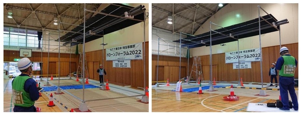 また、同日、富岡市立黒岩小学校の協力のもと、NTT東日本 埼玉事業部 設備部による、社員の橋梁設備点検技術向上に向けたドローン競技会(群馬県立富岡実業高校生徒がエキシビション参加)を実施しました。