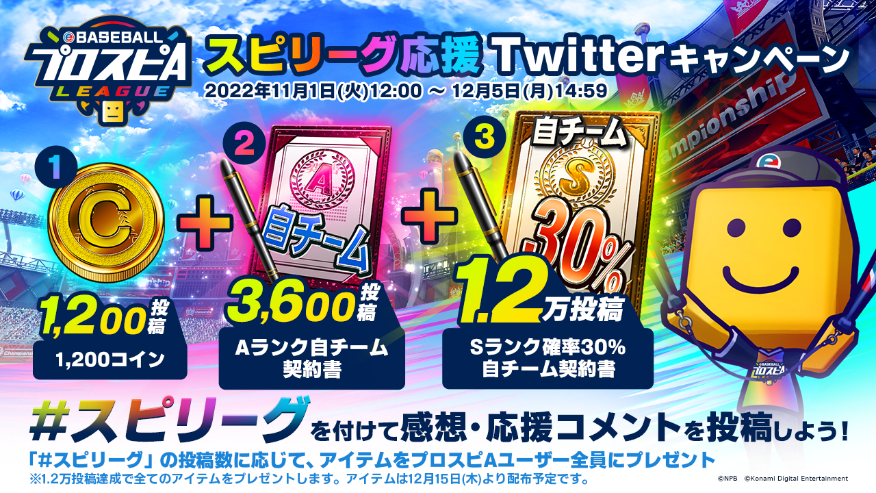 期間中の「#スピリーグ」の投稿数に応じて『プロスピA』ゲーム内アイテムをプレゼント!「#スピリーグ」を付けて感想・応援コメントを投稿してください!!