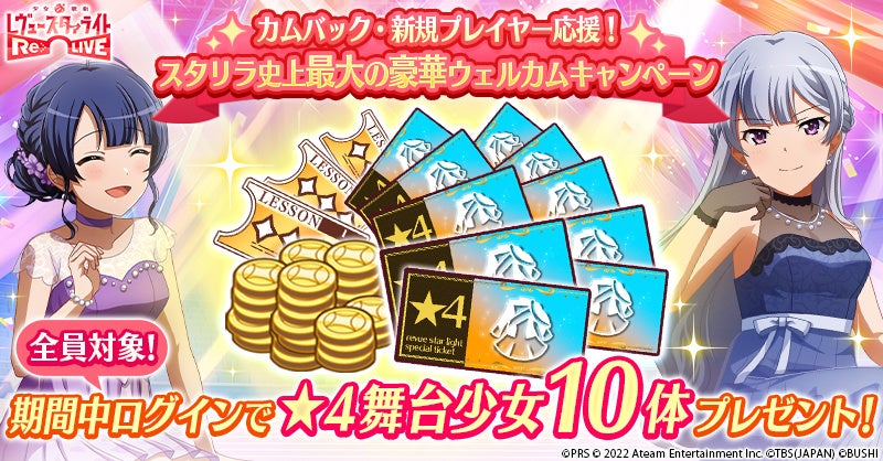 さらに、カムバック・新規プレイヤー応援企画として、『スタリラ』史上これまでにない規模の「豪華ウェルカムキャンペーン」も開催!今ならなんと、プレイヤー全員が初回ログイン時に「厳選★4舞台少女確定ガチャチケット」を10枚受け取ることができます。