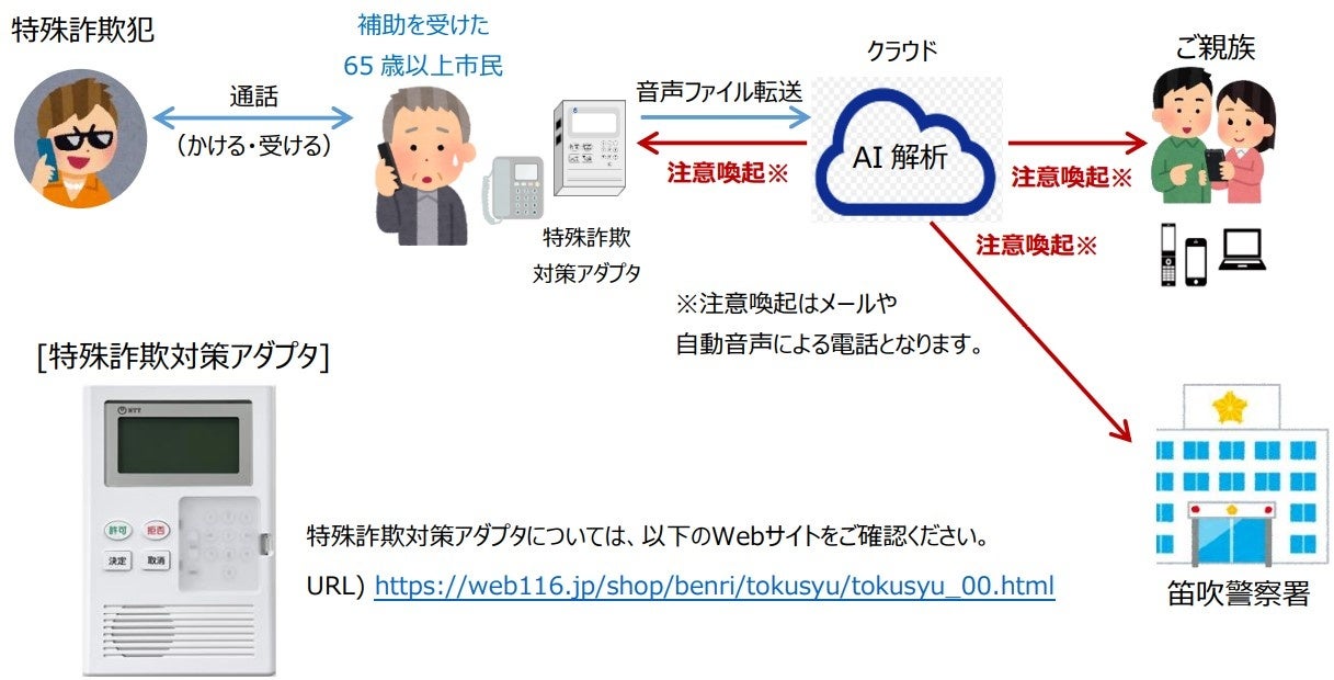 笛吹市様および笛吹警察署様では、特殊詐欺被害の未然防止に向け、2022年11月より、AIによる通話録音デ