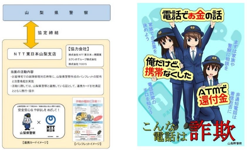NTT東日本 山梨支店では、特殊詐欺被害撲滅に向けて、警察機関および自治体と連携を図り、山梨県民の安全・安心の実現に向けた各種取り組みを展開しています。