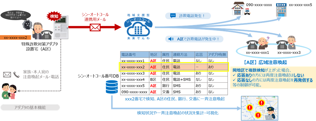 特殊詐欺対策アダプタの検知メール通知機能を「シン・オートコール」※と連携させ、検知メールに記載された特殊詐欺対策アダプタ設置宅の電話番号から設置宅の地区を特定し、当該地区の住民、交番、銀行などへ一斉に注意喚起を発信し、広域防御の仕組み作りに貢献します。